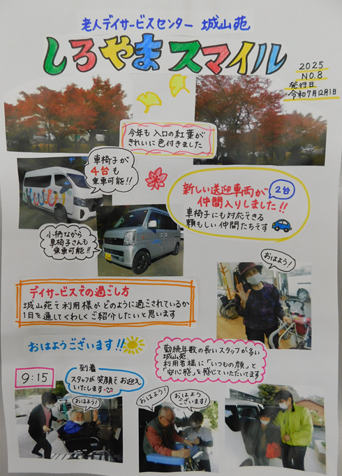 今回は「城山苑での1日」です。いつも、“たくさんの笑顔”が見られ“何か楽しかったなぁ”と感じでもらえるように頑張ってます!